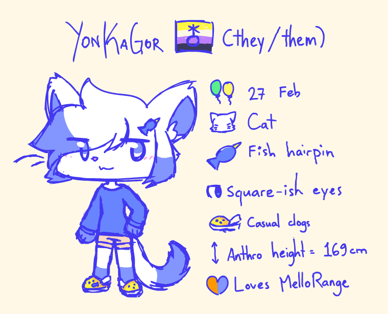 YonKaGor (Real name Yonatan Kristian Yudistira, previously known as JonKaGor) is a Chinese Indonesian musician, artist, and animator. They were born on February 27th, 1999, and are currently 26 years old. They have been producing music for 14 years, and use Pro Tools 12 to create music.[1] They upload songs and animations to their YouTube channel. They're currently living in Ottawa with their wife MelloRange.